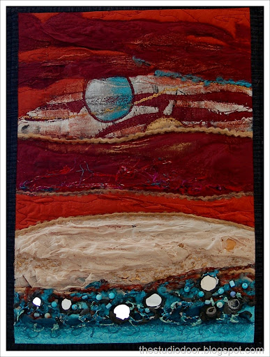 These textile pieces are done in a traditional quilt format as I am trying to get way from framing my textile pieces. The glass tends to dull the colours of the fabric and these wall hangings have dramatic impact! The batik fabrics are an African pattern with gold that really glows under the lights. Very bold and dramatic! There are square gold beads sewn into the black border around the central pattern. Two loops are sewn at the top of the quilt for easy hanging on regular picture hooks. The hooks will be hidden behind the quilt when it hangs flat against the wall.